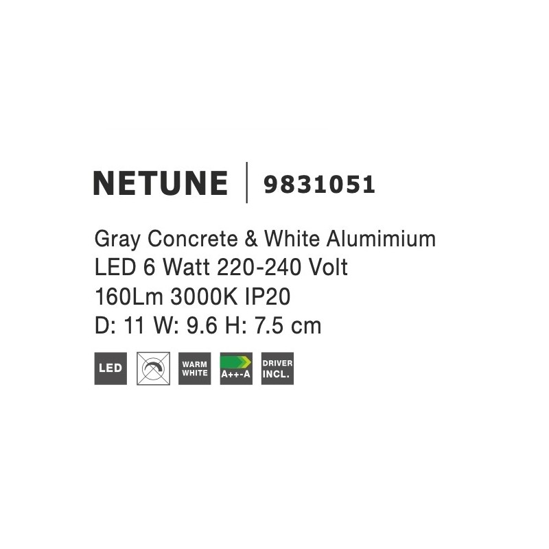 Gray Concrete & White Alumimium LED 6 Watt 220-240 Volt 160Lm 3000K IP20 D: 11 W: 9.6 H: 7.5 cm