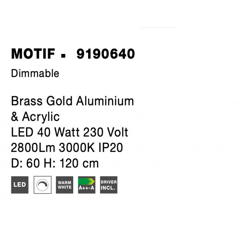 3000K Triac Dimmable Brass Gold Aluminium & Acrylic LED 40 Watt 2943Lm 230 Volt IP20 D: 60 H: 200 cm Adjustable Height