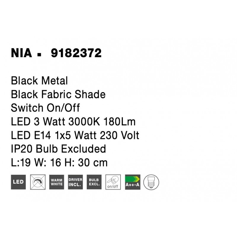 Black Metal Black Fabric Shade Switch On/Off LED 3 Watt 3000K 180Lm LED E14 1x5 Watt 230 Volt IP20 Bulb Excluded L:19 W: 16 H: