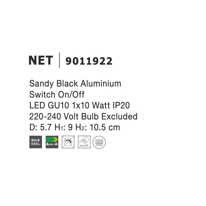 Sandy Black Aluminium Switch On/Off LED GU10 1x10 Watt IP20 220-240 Volt Bulb Excluded D: 5.7 H1: 9 H2: 10.5 cm