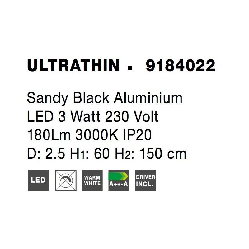 Sandy Black Aluminium LED 3 Watt 230 Volt 180Lm 3000K IP20 D: 2.5 H1: 60 H2: 150 cm Adjustable Height