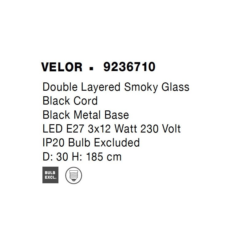 Double Layered Smoky Glass Black Cord Black Metal Base LED E27 3x12 Watt 230 Volt IP20 Bulb Excluded D: 30 H: 185 cm Adjustable