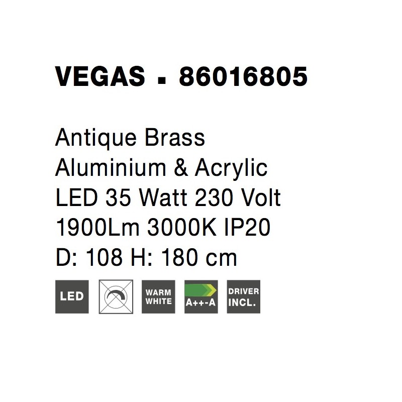 Antique Brass Aluminium & Acrylic LED 35 Watt 230 Volt 1900Lm 3000K IP20 D: 108 H: 180 cm Adjustable Height