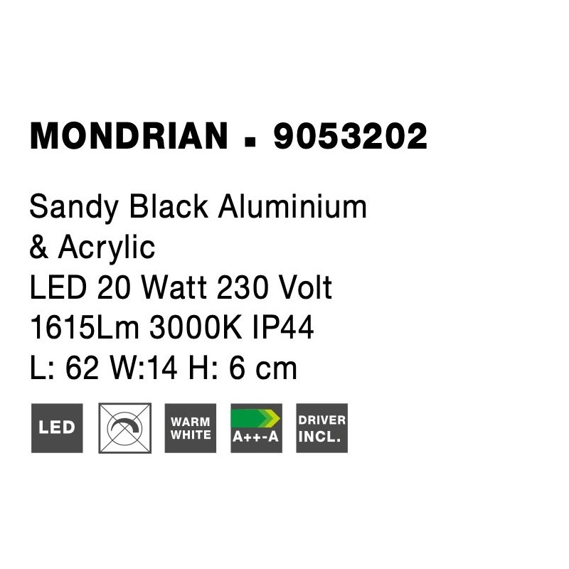 Sandy Black Aluminium & Acrylic LED 20 Watt 230 Volt 1615Lm 3000K IP44 L: 62 W: 14 H: 6 cm