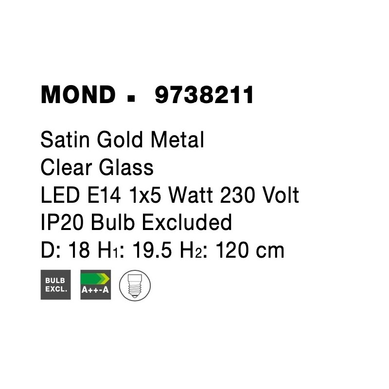Satin Gold Metal Clear Glass LED E14 1x5 Watt 230 Volt IP20 Bulb Excluded D: 18 H1: 19.5 H2: 120 cm Adjustable height