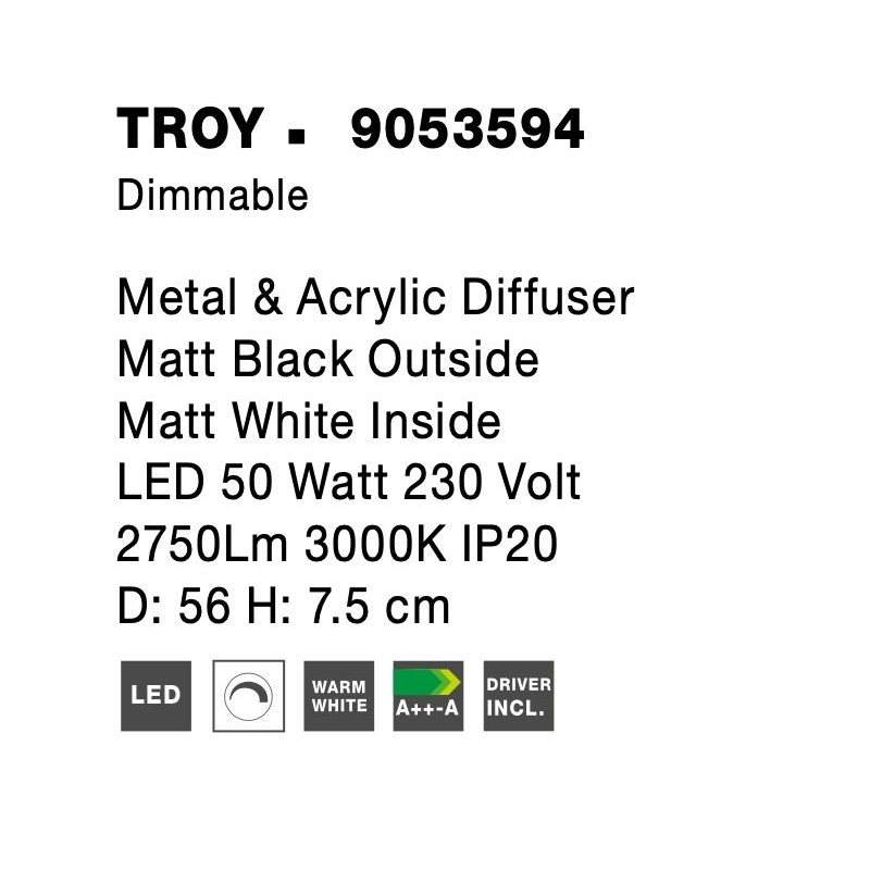 Triac Dimmable Matt Black Metal & Acrylic Diffuser LED 50 Watt 230 Volt 2750Lm 3000K IP20 D: 56 H: 7.5 cm