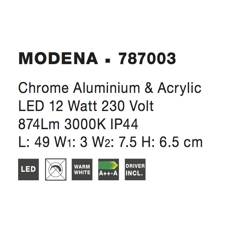 Chrome Aluminium & Acrylic LED 12 Watt 230 Volt 874Lm 3000K IP44 L: 49 W 1: 3 W 2: 7.5 H: 6.5 cm