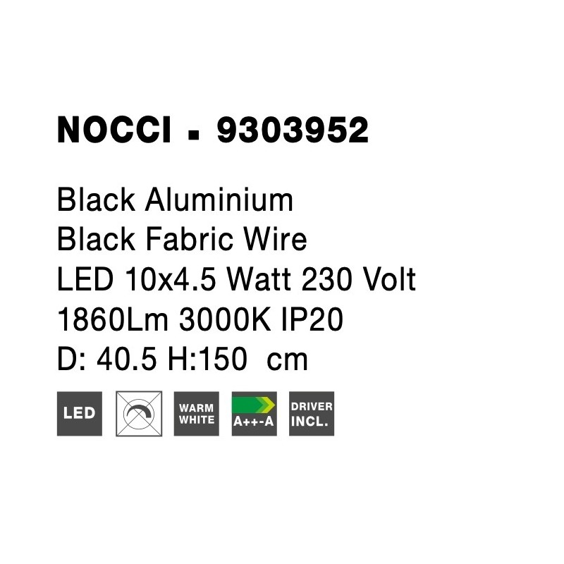 Black Aluminium Black Fabric Wire LED 48 Watt 230 Volt 1902Lm 3000K IP20 D: 40.5 H: 150 cm Adjustable Height