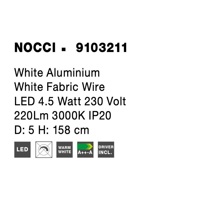 White Aluminium White Fabric Wire LED 4 Watt 230 Volt 290Lm 3000K IP20 D: 5 H: 158 cm Adjustable Height