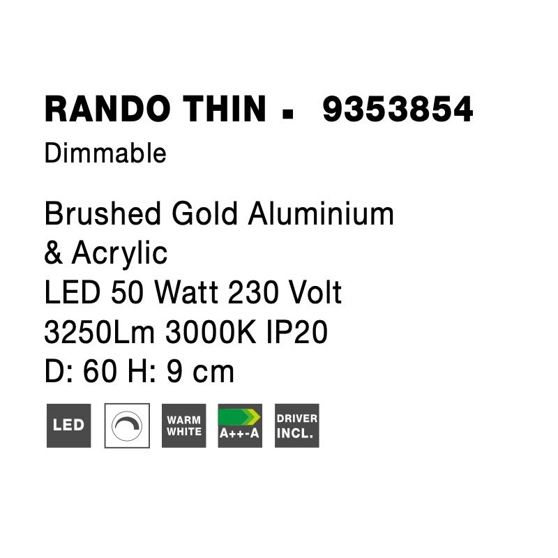 Triac Dimmable Brushed Gold Aluminium & Acrylic LED 50 Watt 230 Volt 2864Lm 3000K IP20 D: 60 H: 9 cm