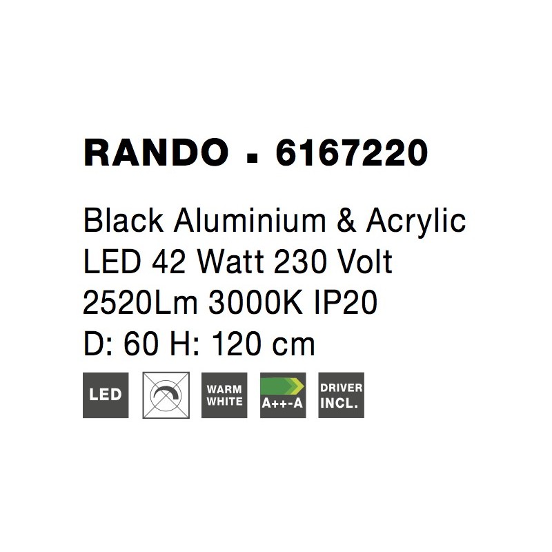 Black Aluminium & Acrylic LED 42 Watt 230 Volt 3010Lm 3000K IP20 D: 60 H: 120 cm Adjustable Height