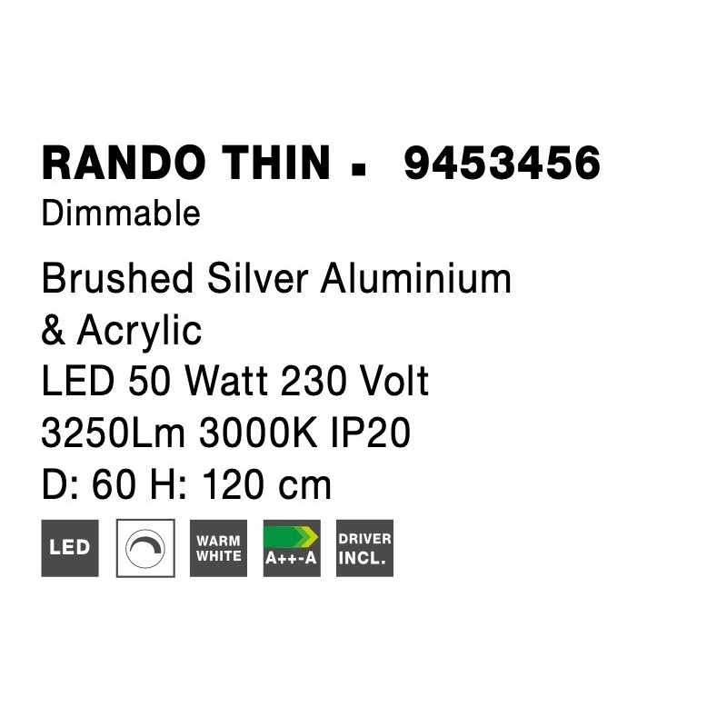 Triac Dimmable Brushed Silver Aluminium & Acrylic LED 50 Watt 230 Volt 2864Lm 3000K IP20 D: 60 H: 120 cm Adjustable Height