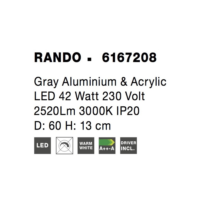 3000K Gray Aluminium & Acrylic LED 42 Watt 230 Volt 2691Lm 3000K IP20 D: 60 H: 13 cm