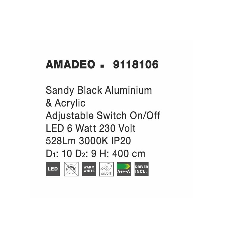 Sandy Black Aluminium & Acrylic Adjustable Switch On/Off LED 6 Watt 230 Volt 528Lm 3000K IP20 D1: 10 D2: 9 H: 400 cm