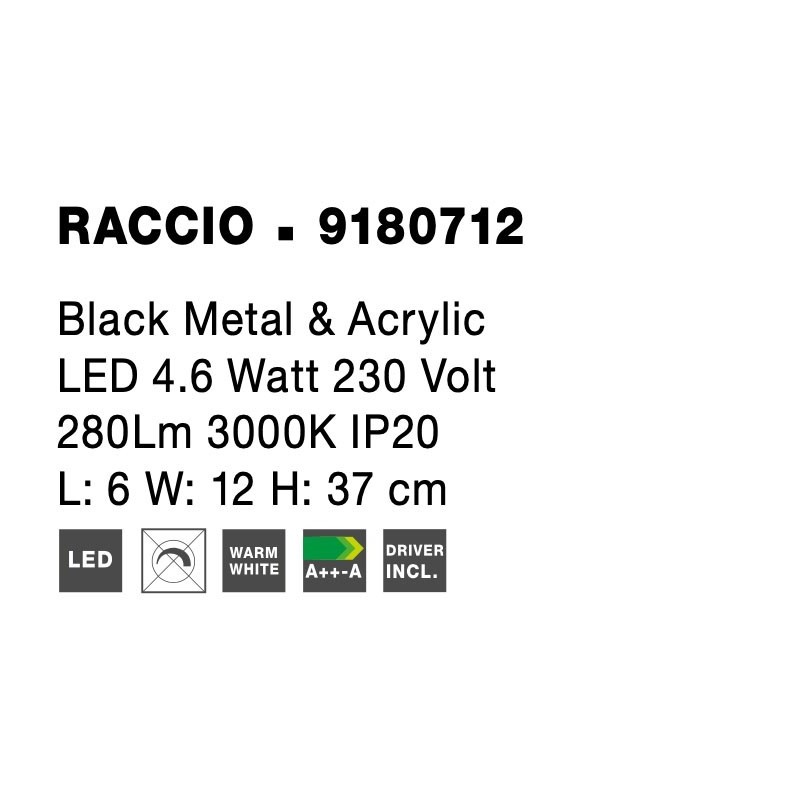 Black Metal & Acrylic LED 6 Watt 230 Volt 426Lm 3000K IP20 L: 6 W: 12 H: 37 cm Rotating & Adjustable