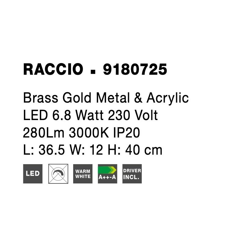 Brass Gold Metal & Acrylic LED 5 Watt 230 Volt 377Lm 3000K IP20 L: 36.5 W: 12 H: 40 cm Rotating & Adjustable