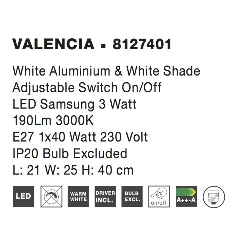 White Aluminium & White Shade Adjustable Switch On/Off LED Samsung 3 Watt 190Lm 3000K E27 1x12 Watt 230 Volt IP20 Bulb Exclud
