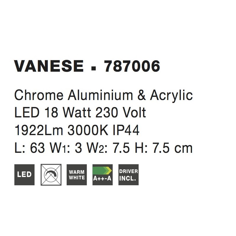 Chrome Aluminium & Acrylic LED 18 Watt 230 Volt 1922Lm 3000K IP44 L: 63 W 1: 3 W 2: 7.5 H: 7.5 cm