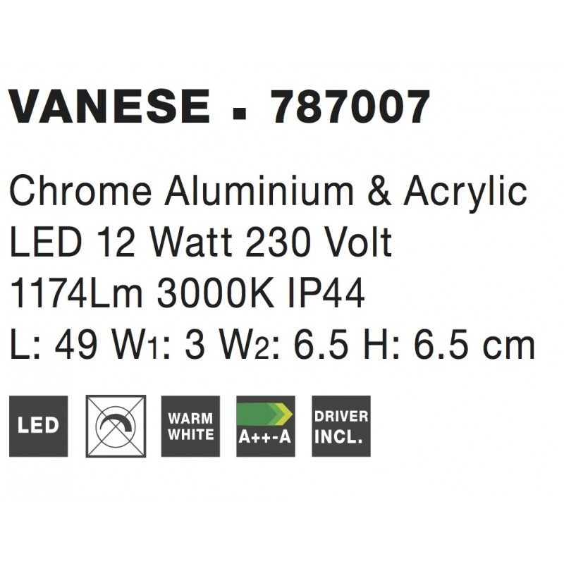 Chrome Aluminium & Acrylic LED 12 Watt 230 Volt 1174Lm 3000K IP44 L: 49 W1: 3 W2: 6.5 H: 6.5 cm