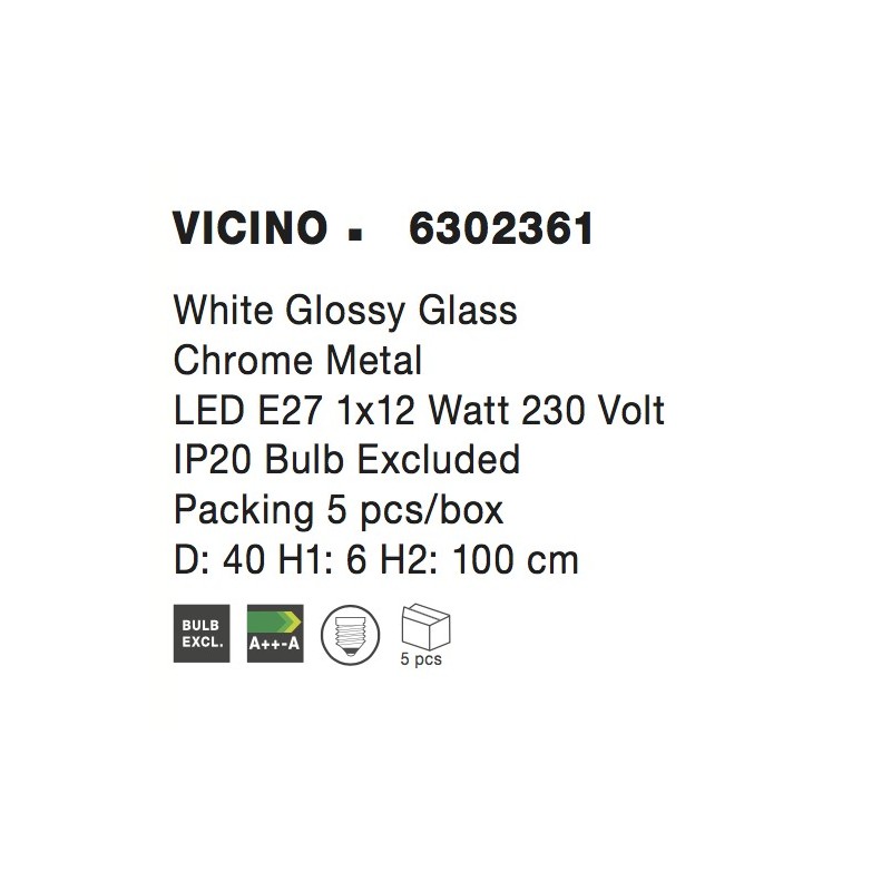 White Glossy Glass Chrome Metal LED E27 1x12 Watt 230 Volt IP20 Bulb Excluded Packing 5 pcs/box D: 40 H 1: 6 H 2: 100 cm