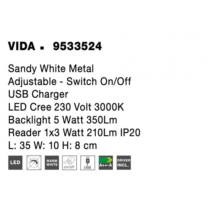 Sandy White Metal Adjustable - Switch On/Off USB Charger LED Cree 230 Volt 3000K Backlight 5 Watt 350Lm Reader 1x3 Watt 210Lm