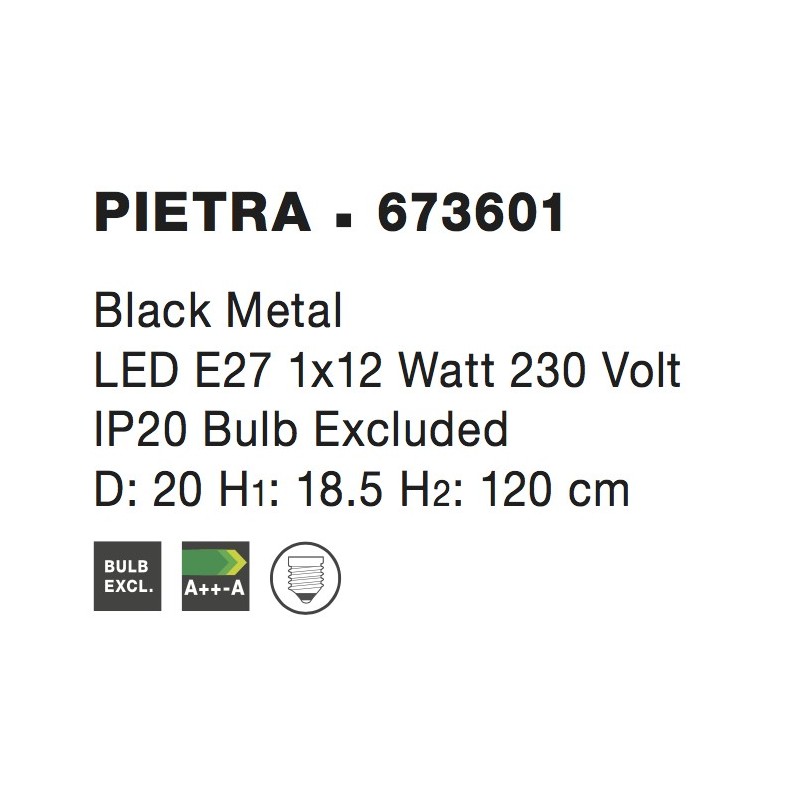 Black Metal LED E27 1x12 Watt 230 Volt IP20 Bulb Excluded D: 20 H1: 18.5 H2: 120 cm Adjustable height