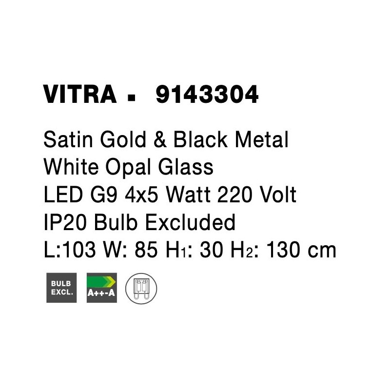 Satin Gold & Black Metal White Opal Glass LED G9 4x5 Watt 220 Volt IP20 Bulb Excluded L:103 W: 85 H1: 30 H2: 130 cm Adjustable h