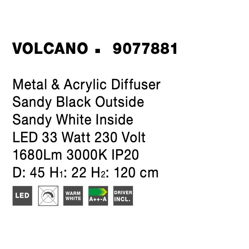 Sandy Black Metal White Diffuser Inside LED 33 Watt 230 Volt 1680Lm 3000K IP20 D: 45 H1: 22 H2: 120 cm Adjustable Height