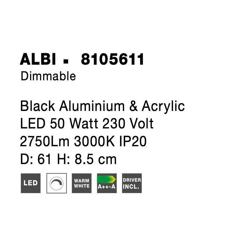 Triac Dimmable Sandy Black Aluminium & Acrylic LED 50 Watt 230 Volt 2876Lm 3000K IP20 D: 61 H: 8.5 cm
