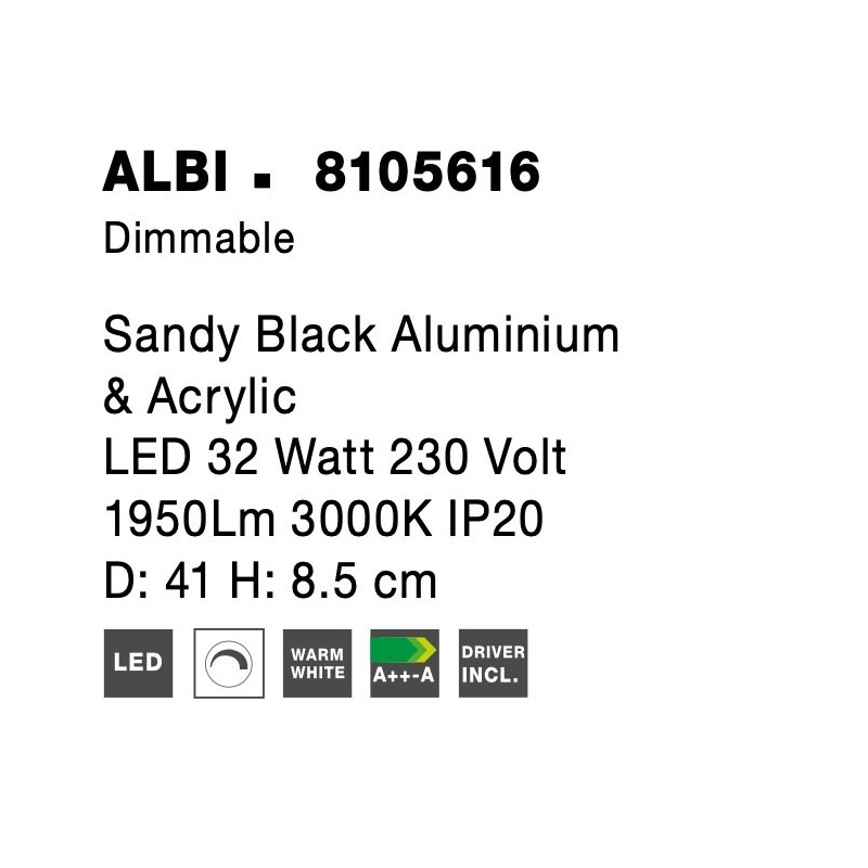 Triac Dimmable Sandy Black Aluminium & Acrylic LED 32 Watt 230 Volt 1952Lm 3000K IP20 D: 41 H: 8.5 cm