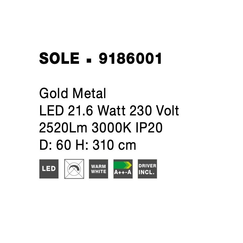 Gold Copper LED 22 Watt 230 Volt 2651Lm 3000K IP20 Led Chip: 60 Pcs D: 60 H: 310 cm Adjustable Height