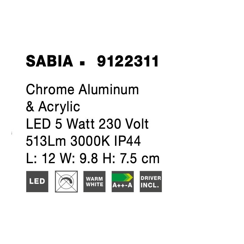 Chrome Aluminium & Acrylic LED 5 Watt 230 Volt 513Lm 3000K IP44 L: 12 W: 9.8 H: 7.5 cm