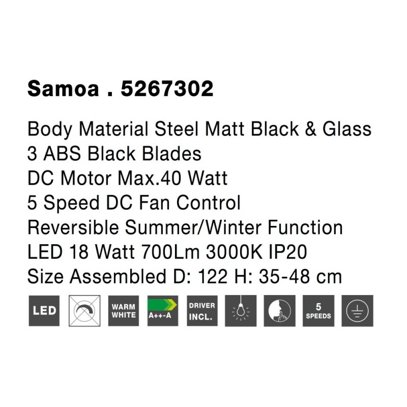 Fan Steel & Glass ABS Blades White or Black,D: 122 H: 35-48 cm 5 Speed Remote, 51cm Blade DC 42W,AC220-240V 5000CFM 220RPM,< 30