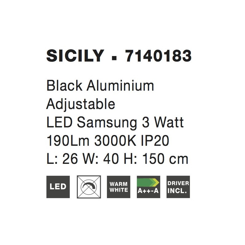 Black Aluminium Adjustable LED Samsung 3 Watt 190Lm 3000K IP20 Cable Length: 200 cm L: 26 W: 40 H: 150 cm