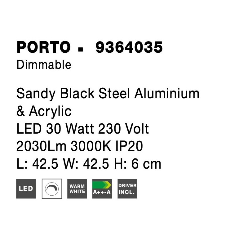 Triac Dimmable Sandy Black Steel Aluminium & Acrylic LED 30 Watt 230 Volt 2030Lm 3000K IP20 L: 42.5 W: 42.5 H: 6 cm