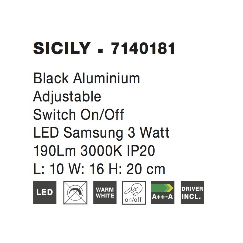 Black Aluminium Adjustable Switch On/Off LED Samsung 3 Watt 190Lm 3000K IP20 L: 10 W: 16 H: 20 cm