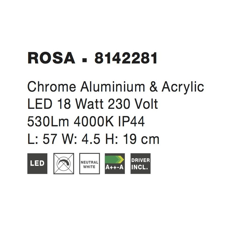 Chrome Aluminium & Acrylic LED 18 Watt 230 Volt 530Lm 4000K IP44 L: 57 W: 4.5 H: 19 cm