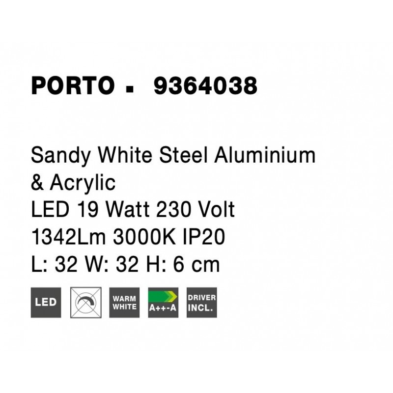 Sandy White Steel Aluminium & Acrylic LED 19 Watt 230 Volt 1342Lm 3000K IP20 L: 32 W: 32 H: 6 cm