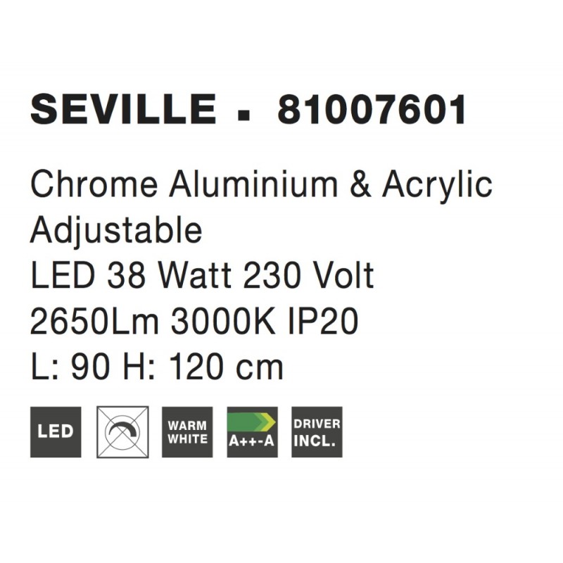 Chrome Aluminium & Acrylic LED 38 Watt 230 Volt 2650Lm 3000K IP20 L: 90 H: 120 cm Adjustable Height & Adjustable