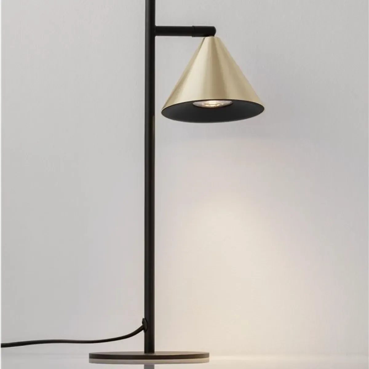 Entièrement conçue en aluminium, cette lampe est à la fois légère et extrêmement robuste. La finition noir sablé apporte une texture haut de gamme qui ne marque pas les empreintes, tandis que le revêtement or intérieur offre un éclat précieux même lorsque la lampe est éteinte.