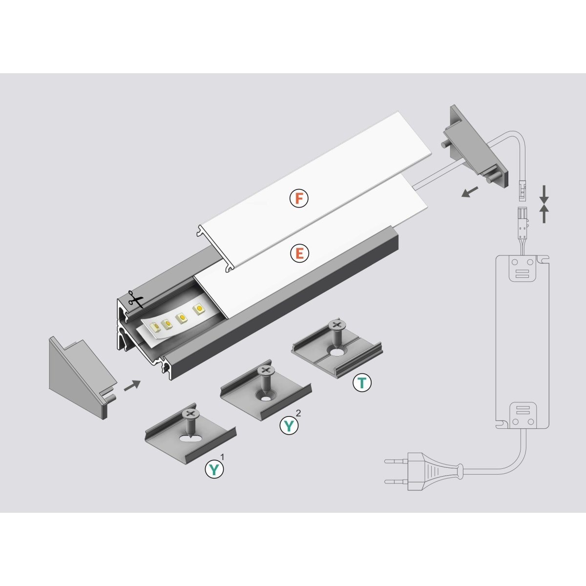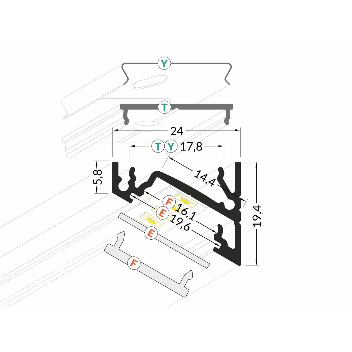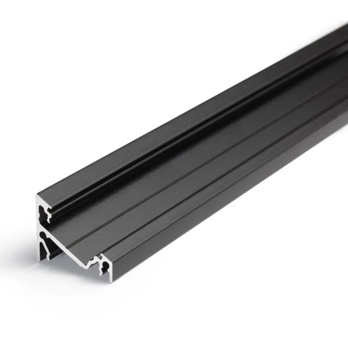 profilé angulaire. La conception de ce profilé permet d’obtenir un angle faisceau de 30° ou 60°, selon votre préférence. Parfait pour l’éclairage des vitrines, monté à plat ou dans les coins. Pour le profilé en aluminium, vous pouvez choisir l'un des 5 diffuseurs en polyester, polypropylène, polycarbonate et les bouchons en plastique ABS. La puissance dépend du type de sources lumineuses à LED utilisée. L'avantage est le grand angle de protection contre l'éblouissement.