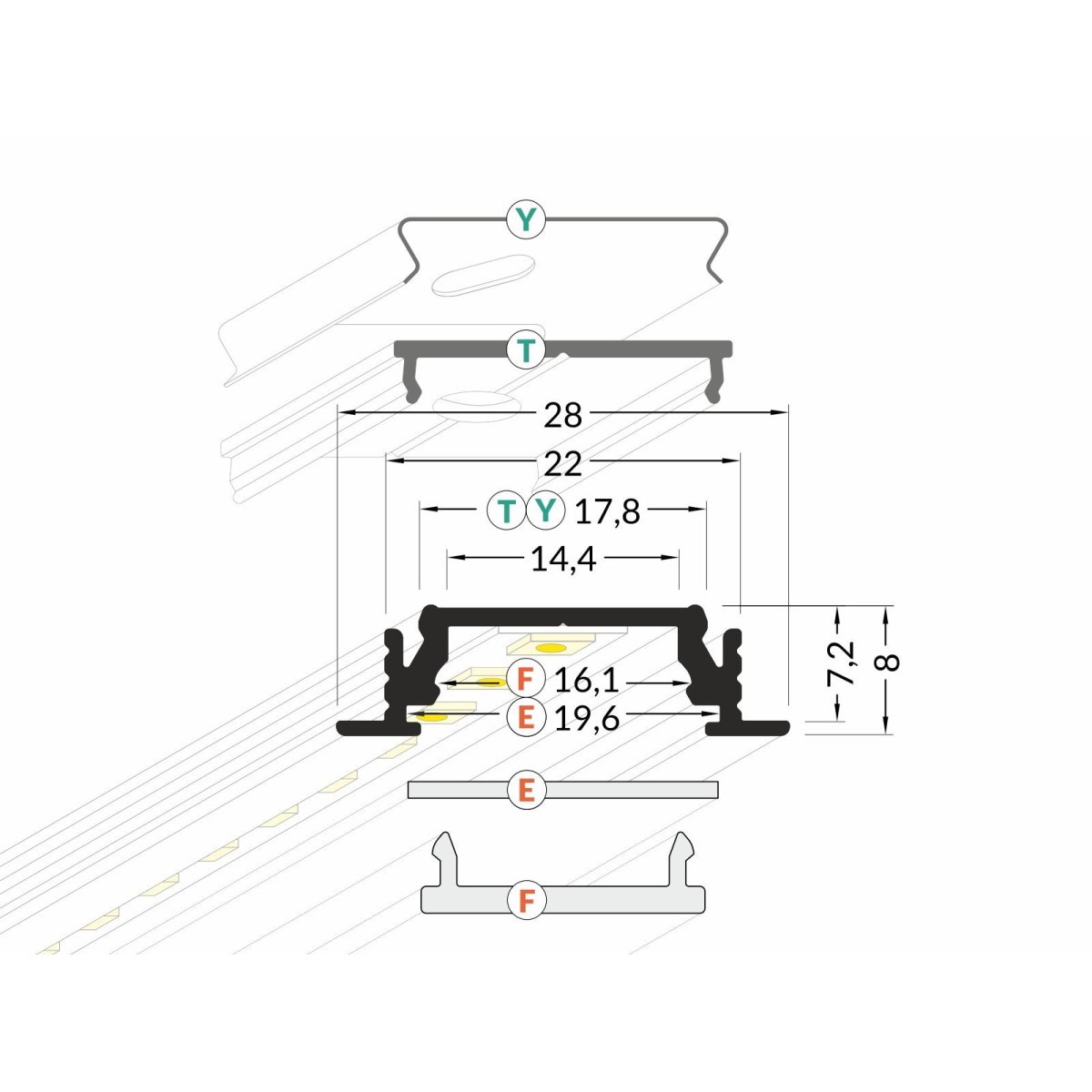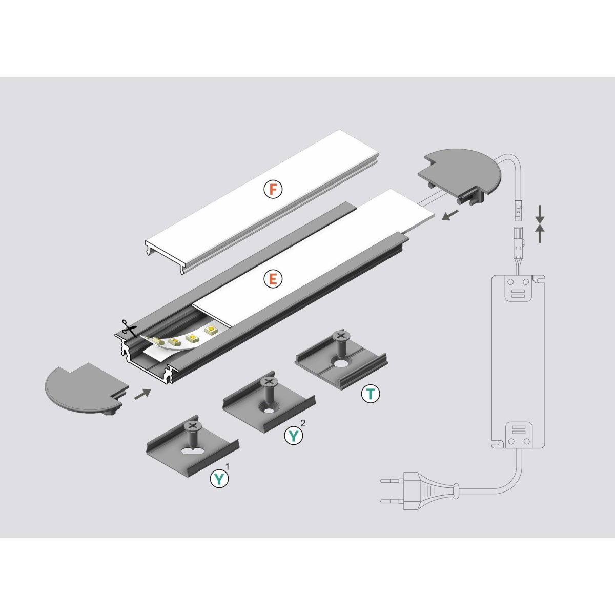 Profilé en aluminium à encastrer dans une rainure de 22 mm, dépassant de la surface de montage seulement de 1mm. Il peut être monté sur le mur, au plafond, dans le carrelage, les meubles en encastrant, en collant ou en utilisant la fixation murale. Pour le profilé en aluminium, vous pouvez choisir l'un des quatre diffuseurs